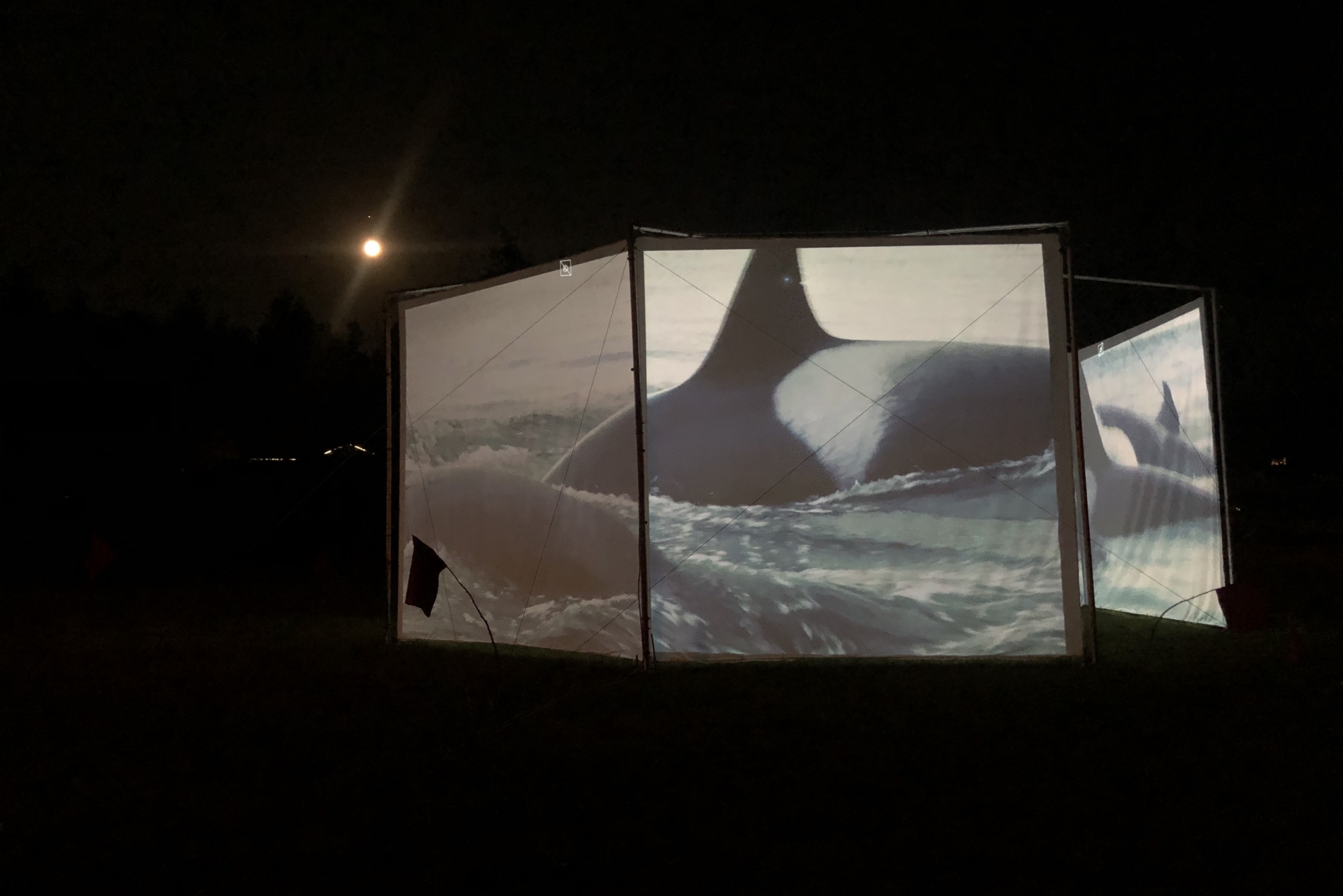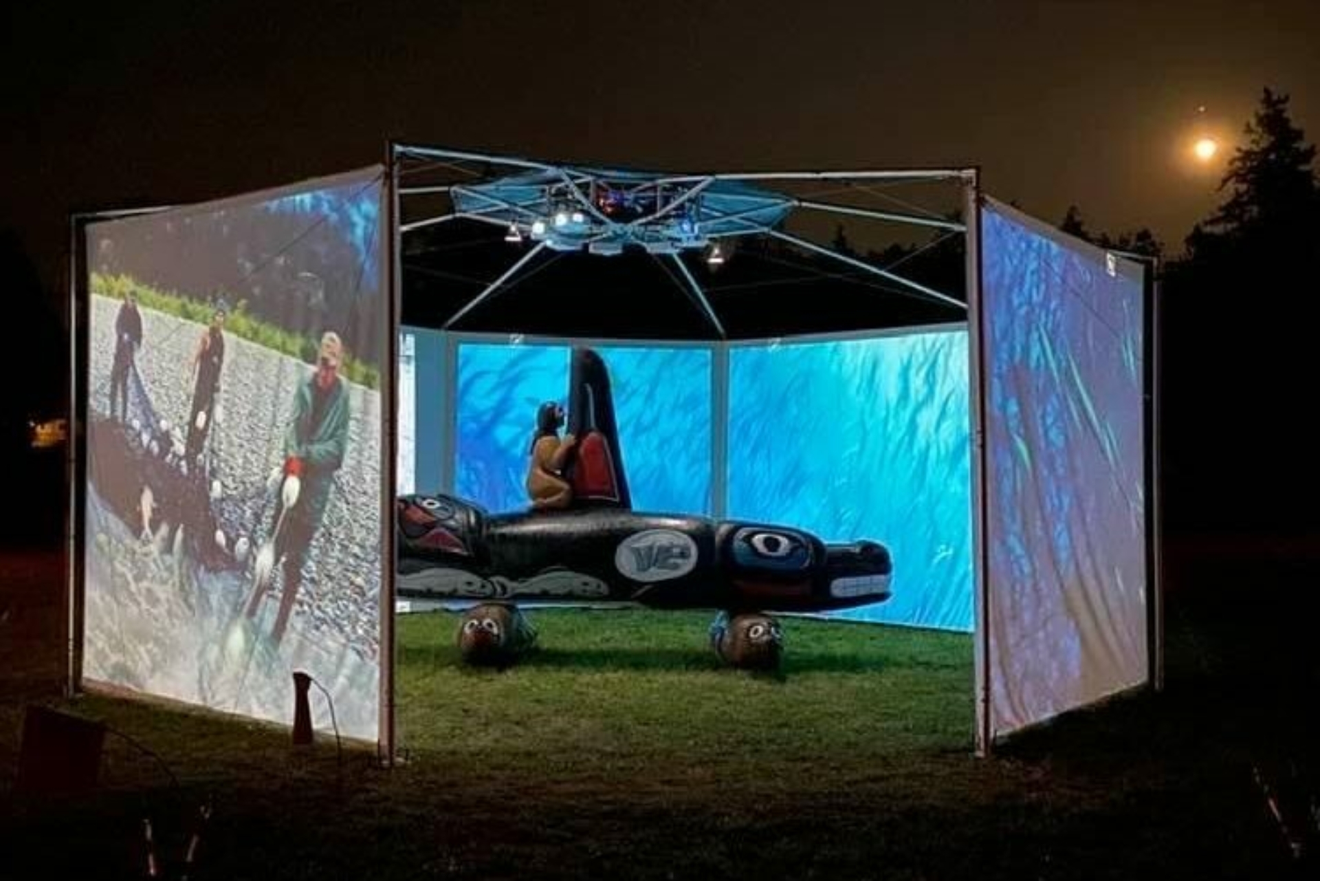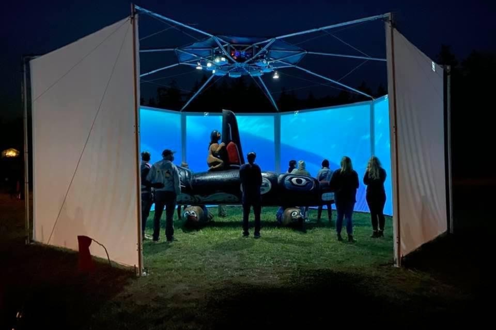 This weekend we debuted our new traveling, outdoor exhibition and IMAX-style film projection venue, with a presentation of “Whale People: Protectors of the Sea“, featuring a 3,000 pound killer whale totem and an award-winning film that tells the story of the environmental emergency through the figure of the orca.