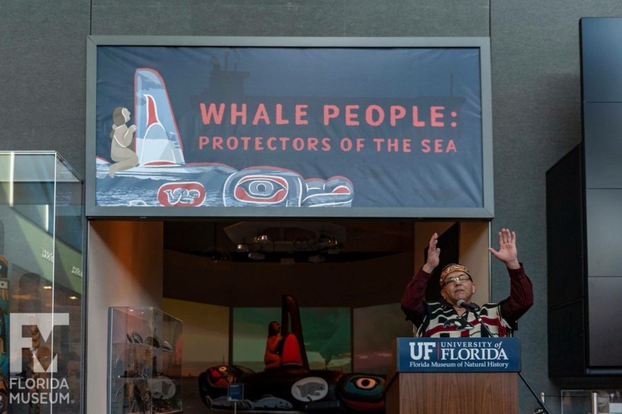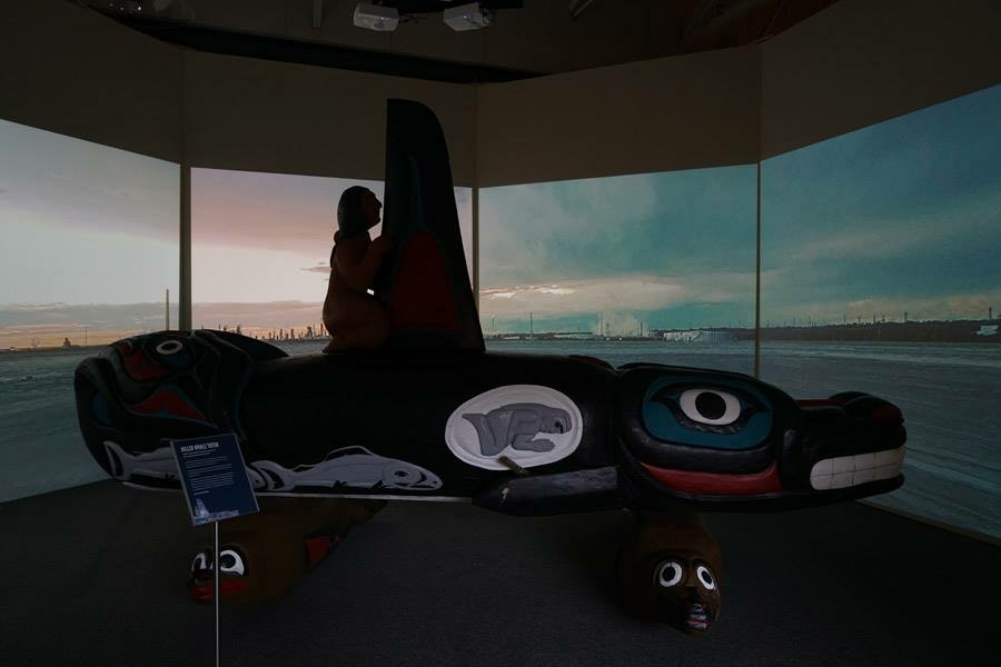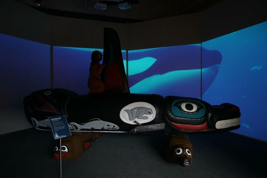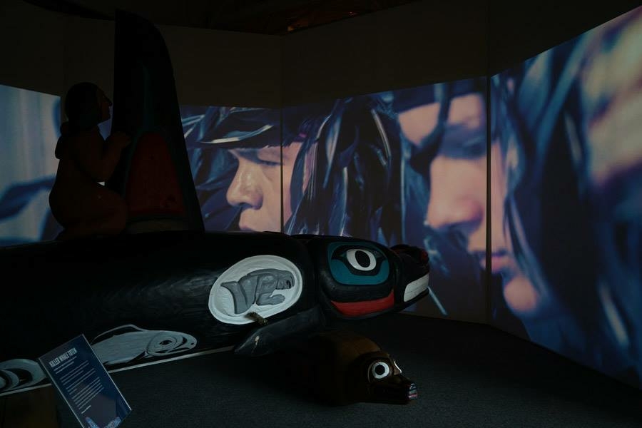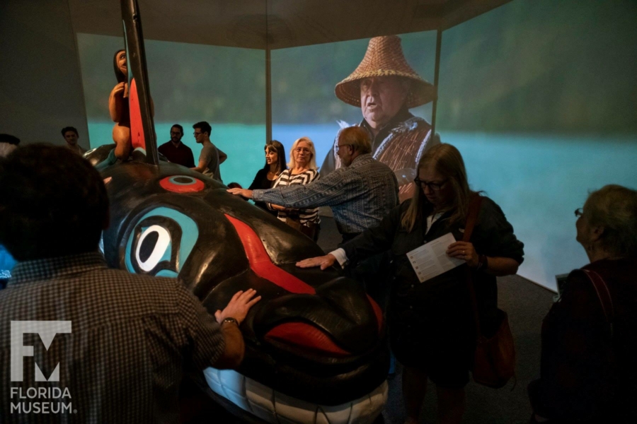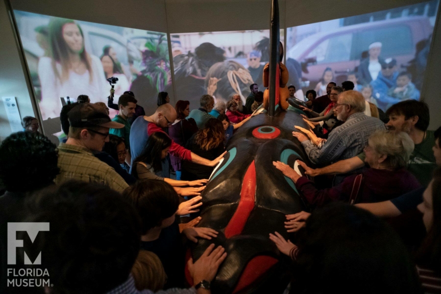 Whale People: Protectors of the Sea brings the whale totem into a museum for the first time, where visitors are invited to lay hands on it as thousands of others have on its journey. Alongside the totem is a selection from the Florida museum’s collection of historical northwest coast totem poles depicting the whale. A seven-channel 90-foot-wide immersive floor-to-ceiling video installation features spectacular underwater footage of the orca, and the voices of Indigenous elders communicate a message that was at the heart of the totem’s journey: what we do to the waters we do to ourselves.