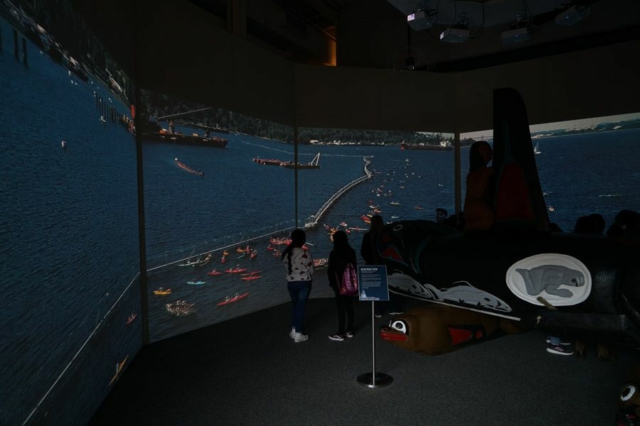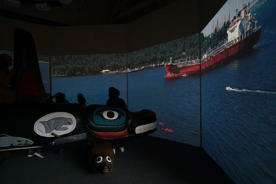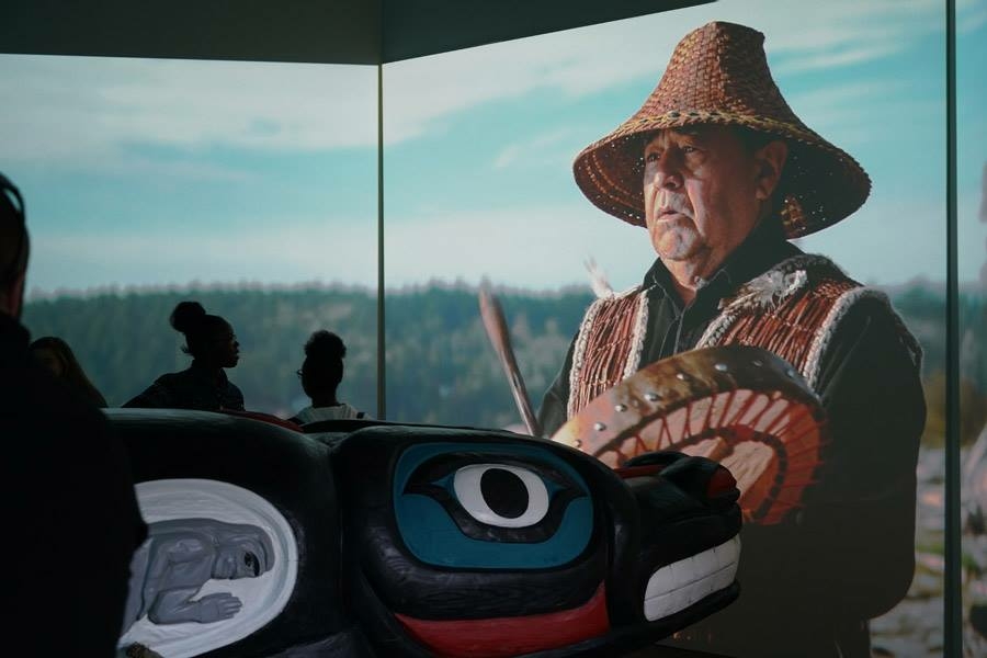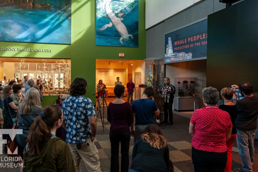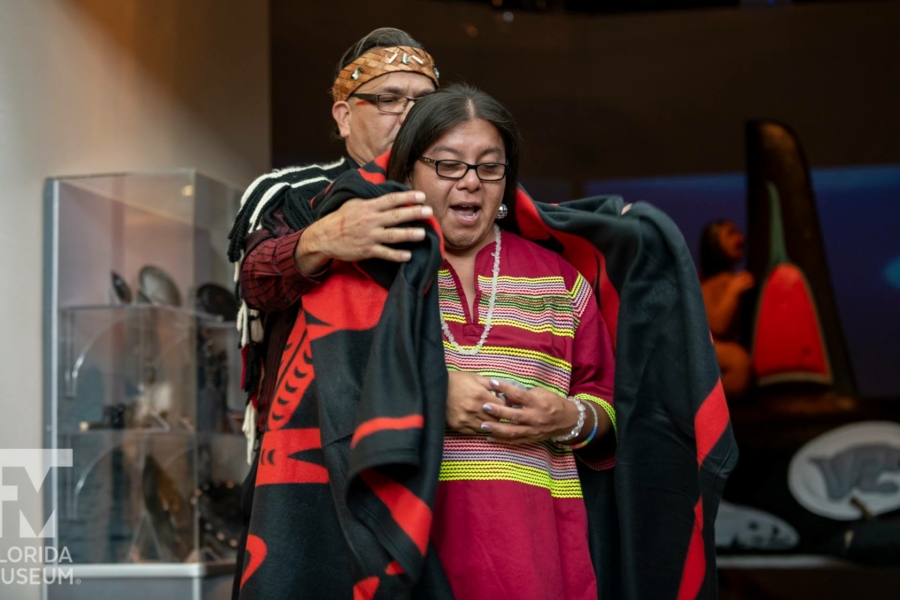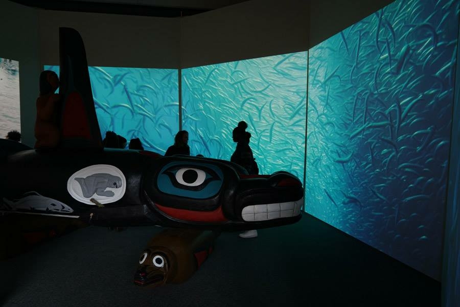 Whale People: Protectors of the Sea brings the whale totem into a museum for the first time, where visitors are invited to lay hands on it as thousands of others have on its journey. Alongside the totem is a selection from the Florida museum’s collection of historical northwest coast totem poles depicting the whale. A seven-channel 90-foot-wide immersive floor-to-ceiling video installation features spectacular underwater footage of the orca, and the voices of Indigenous elders communicate a message that was at the heart of the totem’s journey: what we do to the waters we do to ourselves.